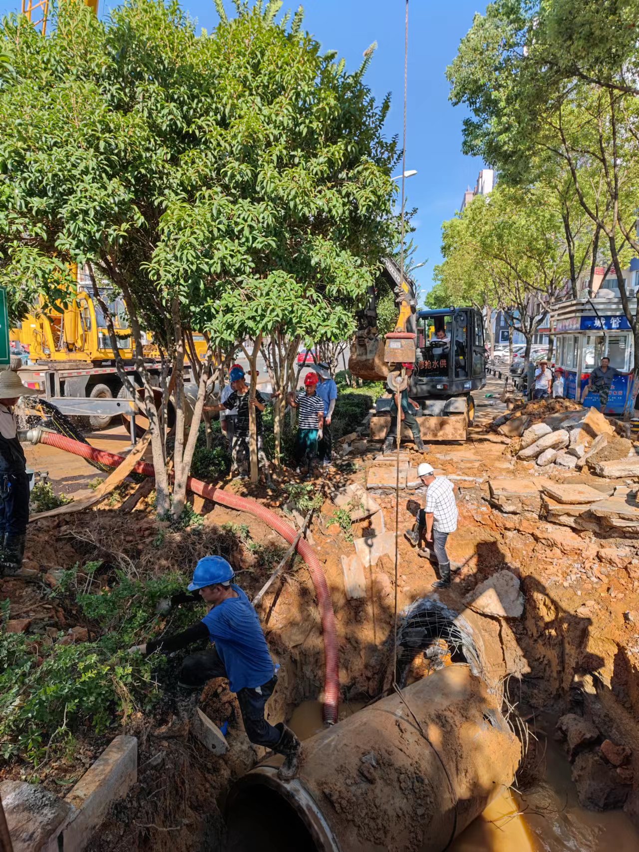 此次爆管口徑大,積水多,并且事發(fā)地位于交通主干道,周圍環(huán)境復(fù)雜,給協(xié)調(diào)開挖和排漬工作帶來(lái)不小困難。