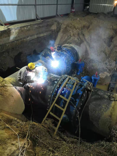 凌晨一點,施工作業(yè)車輛正在對原有內徑為1.4米的水泥管道進行破除,待余水放完之后,將會與新的內徑為1.6米的改遷管道進行碰頭連接。為盡快完成施工,公司分班組對兩處碰頭連接工程進行同步實施,電焊工和機械操作人員隨時待命,通宵作業(yè)。