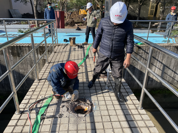 11月10日,在三水廠一期回收水池上,幾名機修工正在進行切割拆除工作,完成原有舊設(shè)備拆除后,他們將進行回收水池攪拌系統(tǒng)升級改造。